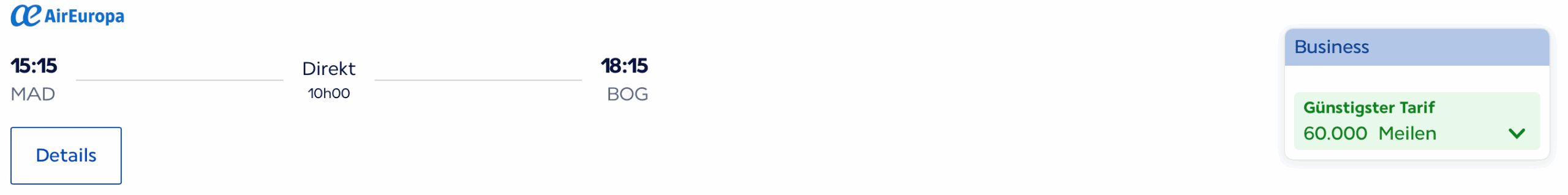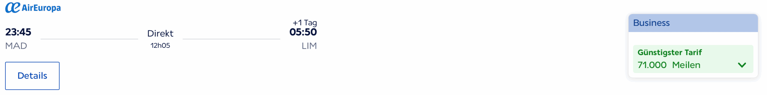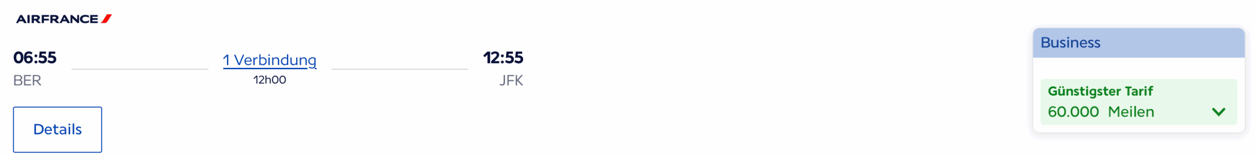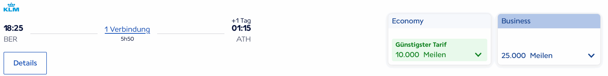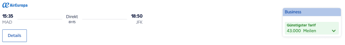 Occasionally, there are also long-haul business class offers, starting at 45,000 miles to North America. Due to dynamic pricing, the price may vary slightly when including a feeder flight from elsewhere in Europe.