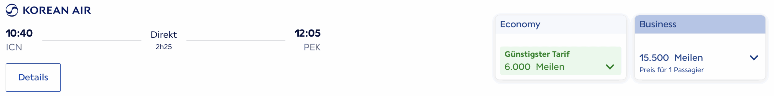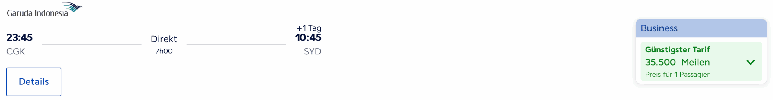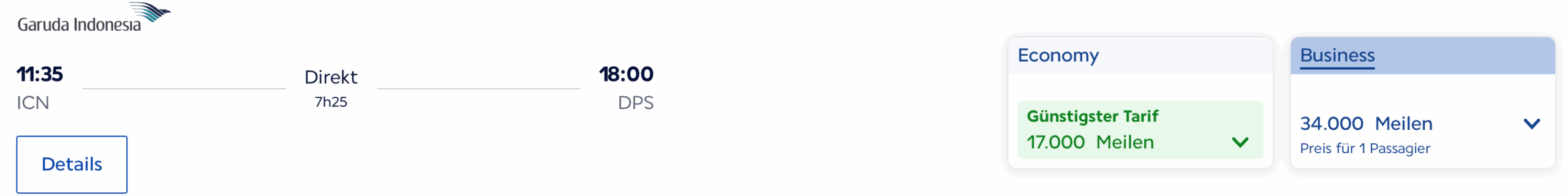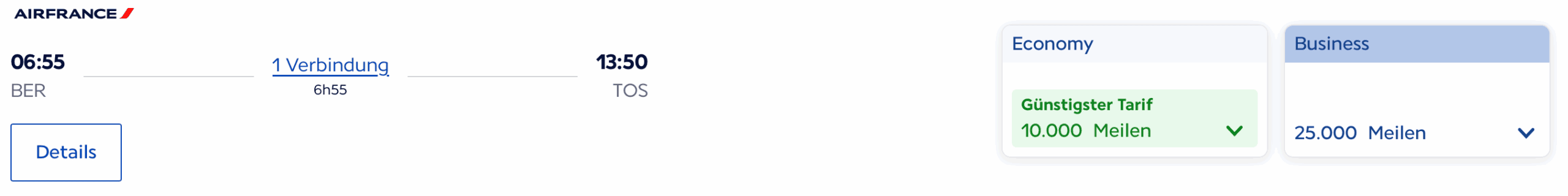 Occasionally, there are also long-haul business class offers, starting at 45,000 miles to North America. Due to dynamic pricing, the price may vary slightly when including a feeder flight from elsewhere in Europe.