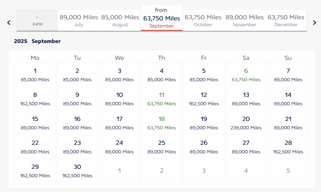 Finding Air France and KLM availability is not difficult, unless you want low prices. For that, the “best price search” on the Air France/KLM website is recommended: search for an award flight with flexible dates, and you’ll see a month-long calendar with the cheapest dates highlighted in green.