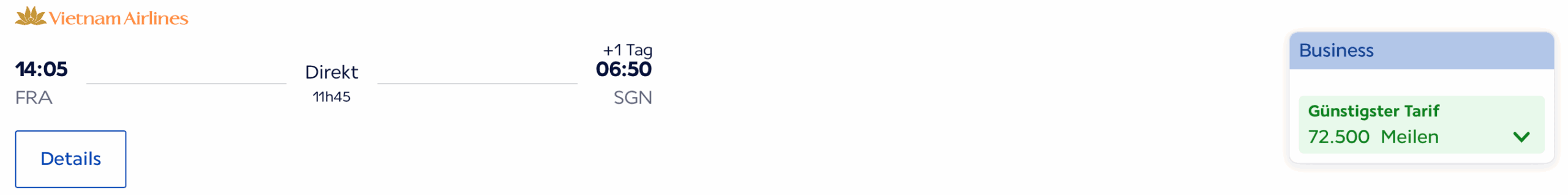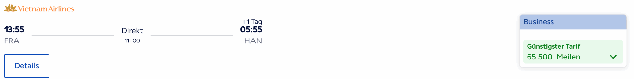 Another sweet spot is Vietnam Airlines business class flights. These start from just 64,000 miles + €316 in taxes and fees from Germany. From Vietnam, flights start at 64,000 miles + €201. While the airline may not compete with top Asian carriers, the price is attractive enough to offset potential shortcomings.