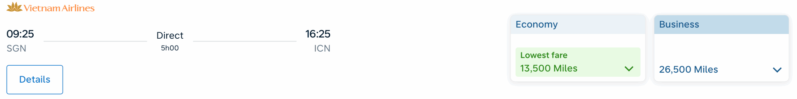 • 13,500 miles + €15 for Saigon–Seoul in economy