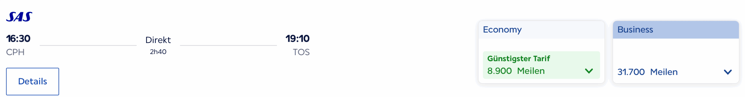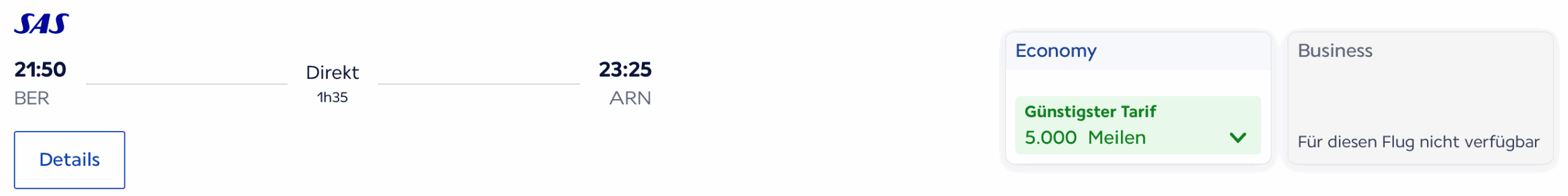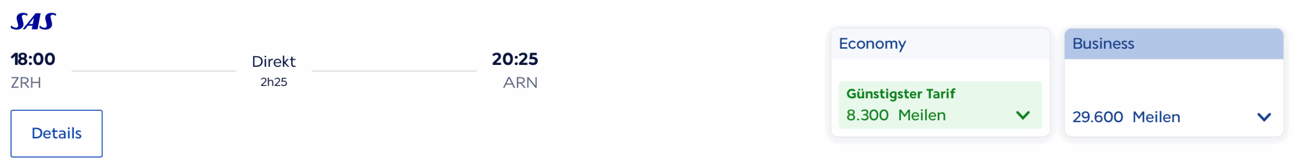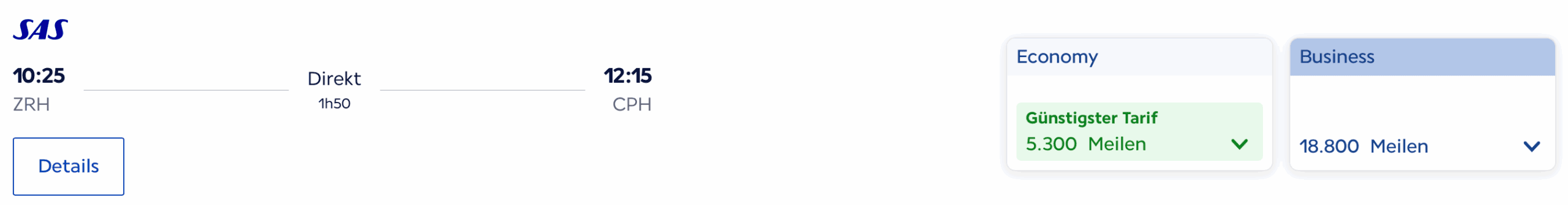 Another sweet spot is short European routes with SAS. One-way flights start at 5,000 miles + €35 in taxes and fees, including 23 kg checked baggage. Prices rise with distance. Zurich–Copenhagen costs 5,300 miles; Zurich–Stockholm, 8,300 miles. Still cheaper than Air France/KLM flights, which start at 10,000 miles.