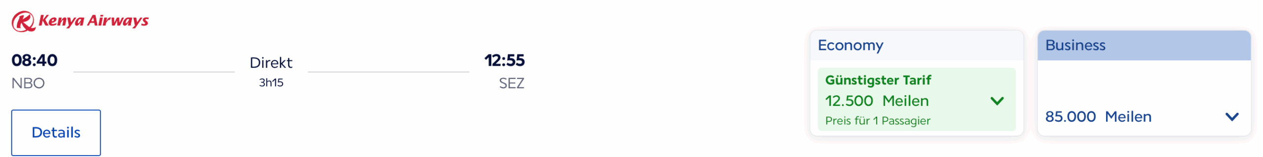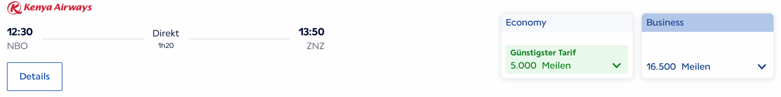 There are also interesting options within Africa. Short Kenya Airways flights start at 5,000 Flying Blue miles. For example, Nairobi–Zanzibar costs 5,000 miles plus around €110 including 2×23 kg checked baggage. Although the surcharges look high at first glance, cash fares on this route often cost €220 per direction, giving you excellent value per mile.