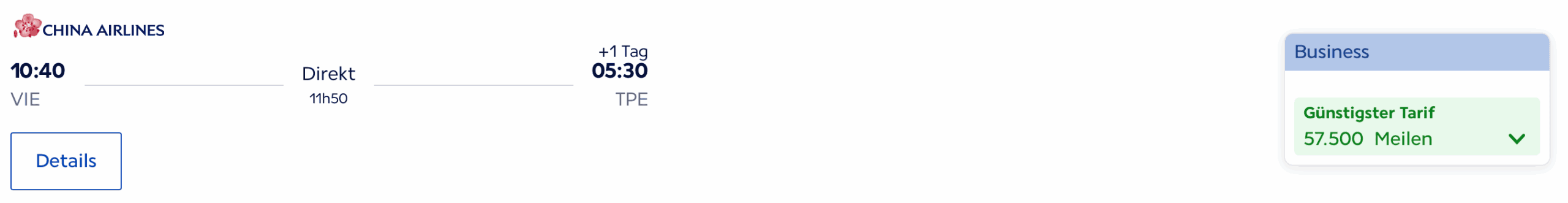 Even more attractive in terms of miles are business class flights with China Airlines between Europe and Taiwan from 57,500 miles per direction. Flights from Europe start at around €210 in fees, and flights to Europe at €194.