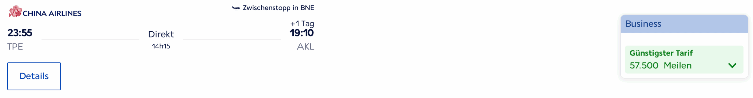 Other SkyTeam partners also offer good value. For example: Taipei–Brisbane–Auckland with China Airlines for 57,500 miles + €85. About 12 hours of lie-flat business class time after subtracting the short Brisbane layover.