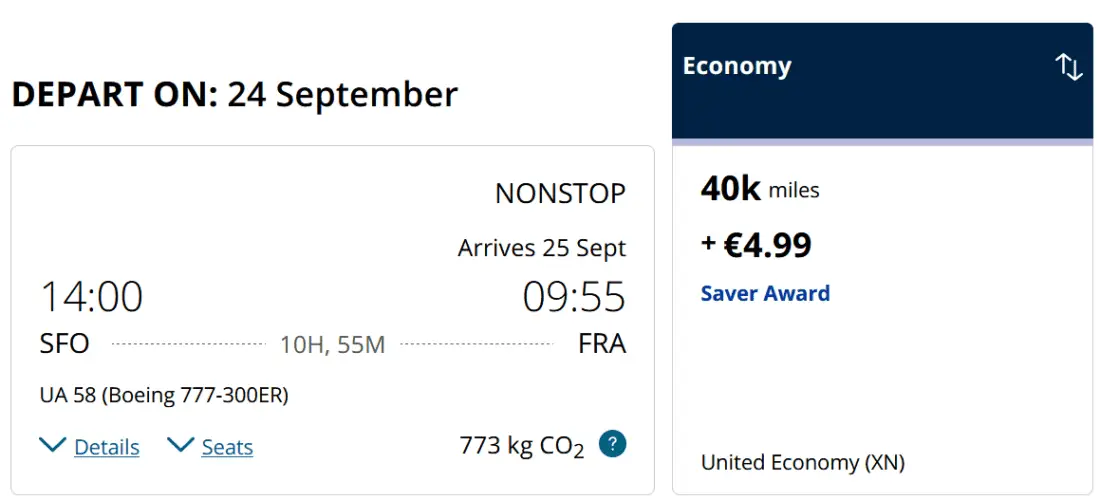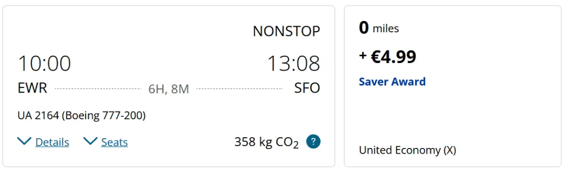 This way, the segment New York – San Francisco costs only 0 miles + €4.99. Normally, it would require 12,000 miles (+ €4.99 taxes):