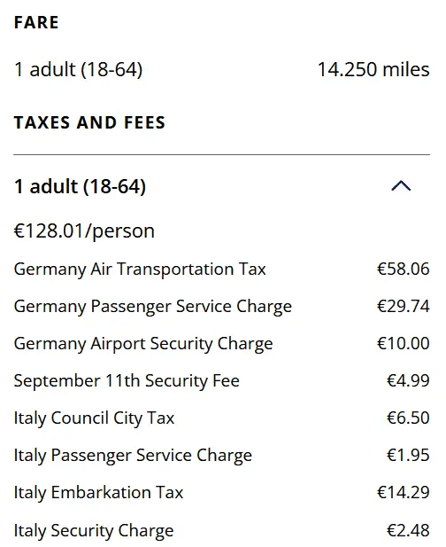 In this case, United calculates a hefty €58.06 as air transportation tax, which is the same as for a long-haul flight from Germany: