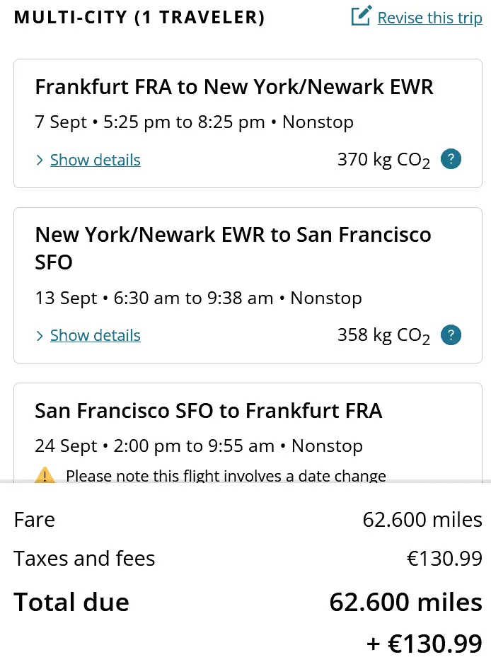 The entire multi-city trip then costs 62,600 miles plus €130.99. The price is made up of: