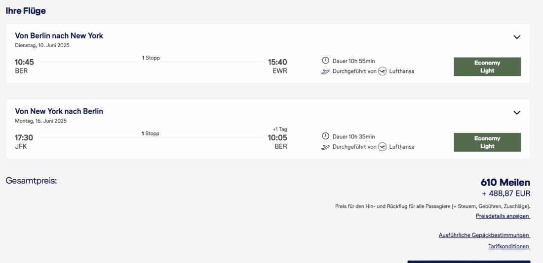 Most programs use a so-called award chart to determine prices for mileage exemptions (Miles&More still does for most of its partner airlines). When trying to redeem miles, you have a fixed price you have to pay for a certain route. Let’s say you want to fly from Berlin to Newark in business – in order to get these tickets, you have to pay 66,000 miles + taxes & surcharges. From that point on, there are just two options: Either there are award availabilities on these flights, and you can book them. Or there aren’t award availabilities and you can’t. This happens largely independently of the cash price the airline charges for the flight on the same day.