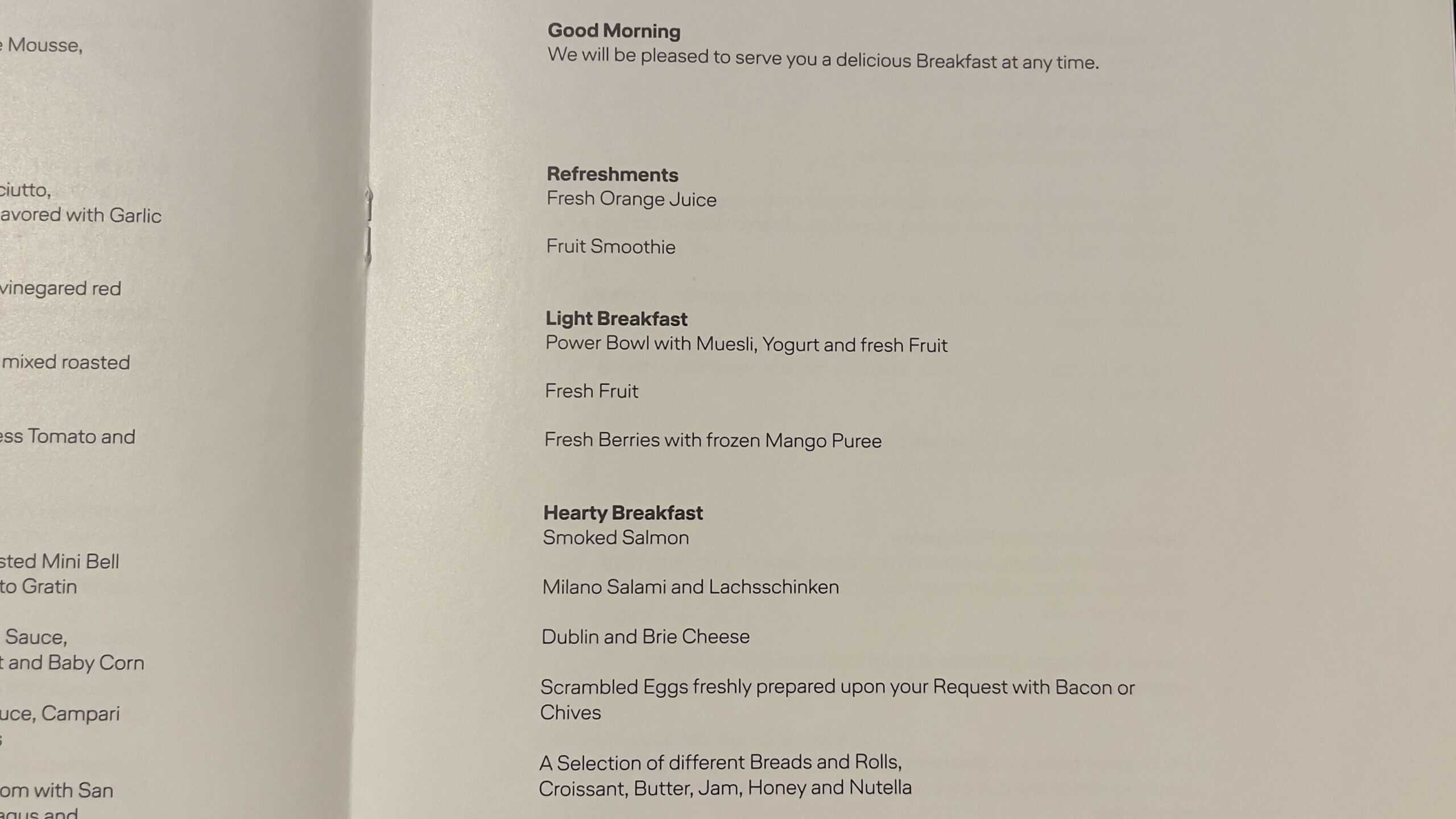 The beverage menu for the return flight to Munich was identical to that of the outbound flight, so the previously mentioned critiques also apply, such as the absence of cocktails and relatively inexpensive beverage options for First Class. The only notable difference was the smoothie served at breakfast, which tasted mediocre and was rather sweet. As a result, I stuck to orange juice and cappuccino.