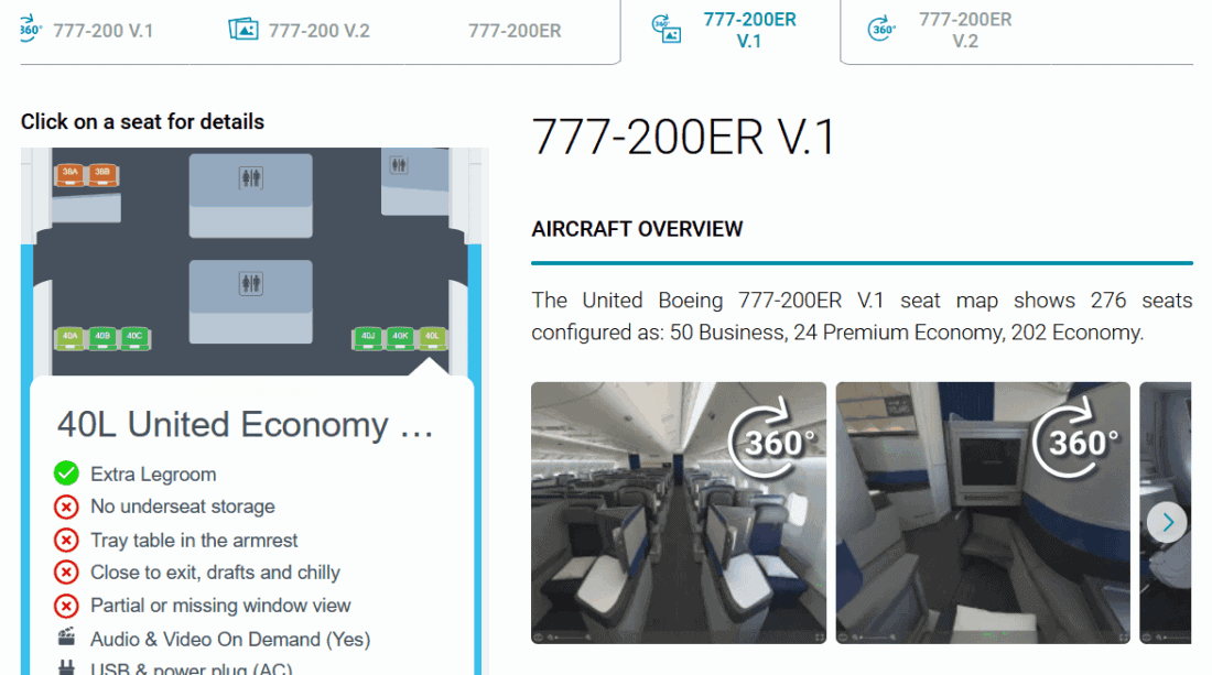 The colour scale of each seat indicates whether a seat is considered positive or negative. Clicking on a seat will show more information. However, these indications often rely on assumptions, and you’ll see statements like “Recline might be limited.”
