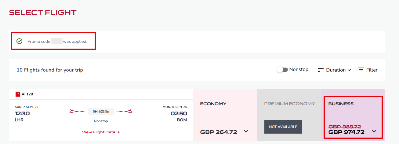 While Air India states the the discount only applies to select routes, it doesn’t give a full list of flights that it can be applied to. The landing page lists countries between which the discount may be applicable, but that doesn’t mean every possible connection is discounted. For example, flights from London to Mumbai usually come with a discount, but the code doesn’t work on flights from London to Kolkata.