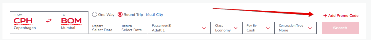 To redeem Air India’s promo code, it’s best to simply open the landing page and enter the code above the search mask: