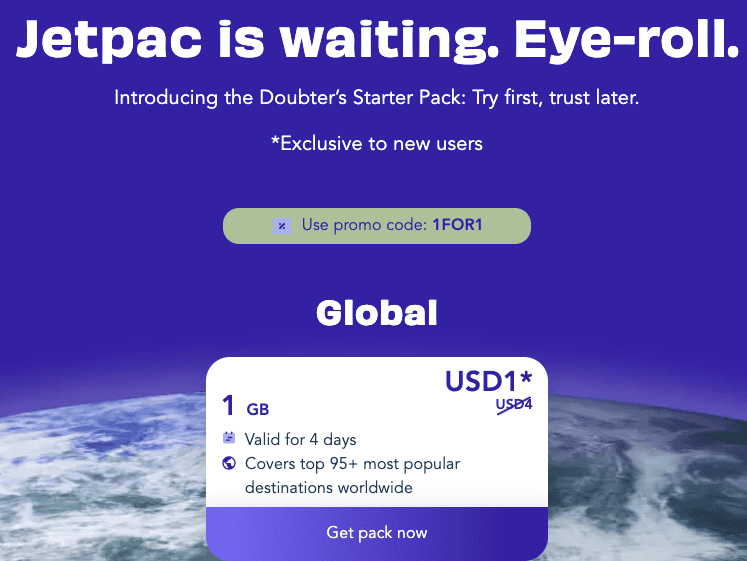 Jetpac is a new global eSIM brand by Circles.Life, a Singaporean telecommunications provider. To test the service, you can currently secure 1 GB of data usable in over 95 countries worldwide for 4 days for the price of only US$1.00 (~€0.86) instead of US$4.00 (~€3.44) with a coupon – it will be applied automatically, but you can also retrieve it here: