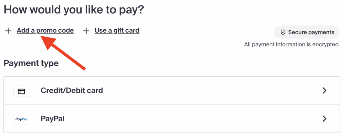 To redeem the promo code, you need to select one of their offers and proceed to the payment page. There, you can enter the code below your personal data and above your payment information: