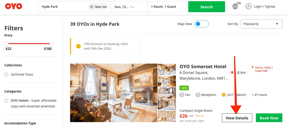 You can enter the coupon code after selecting a hotel by clicking on View Details. Don’t click on Book Now, as you then won’t get a chance to apply your coupon.