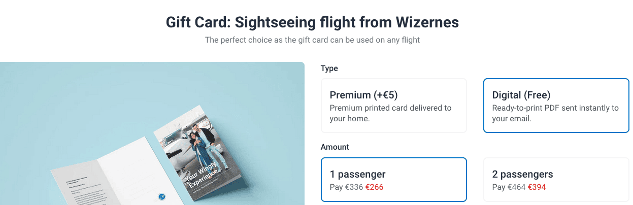 In the next step, you can purchase the gift card with the desired value. The site even offers you prices for one, two or three persons on the same flight and adjusts the value of the gift card.