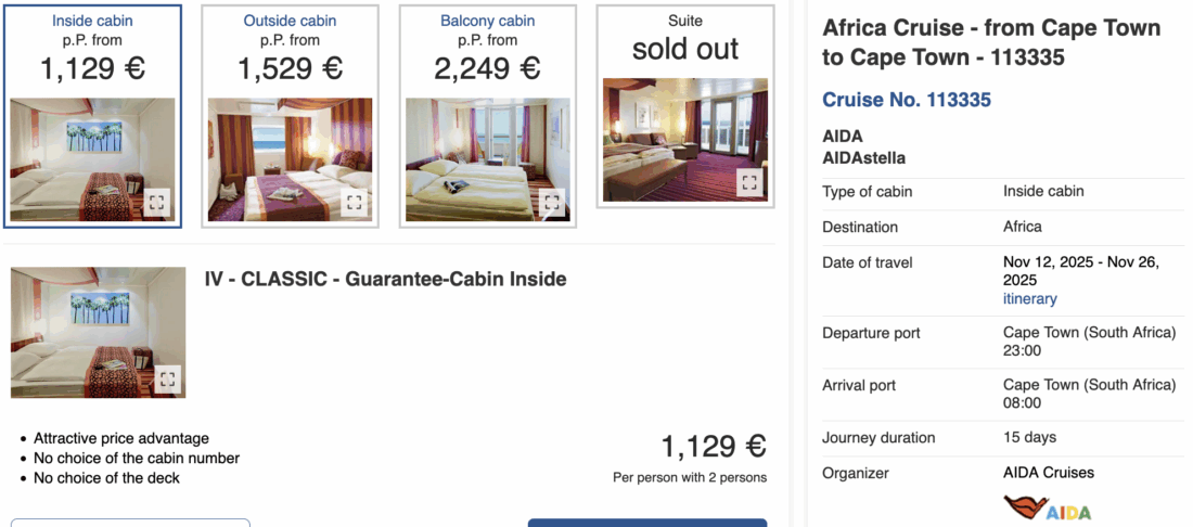 With the AIDAstella from AIDA Cruises, you can embark on a South Africa & Namibia cruise in November 2025. The journey takes you from Cape Town, South Africa and includes stops in South Africa and Namibia, such as Durban, Walvis Bay, and Lüderitz. You can currently book a 14-night cruise in an inside cabin from just €1,129 per person.