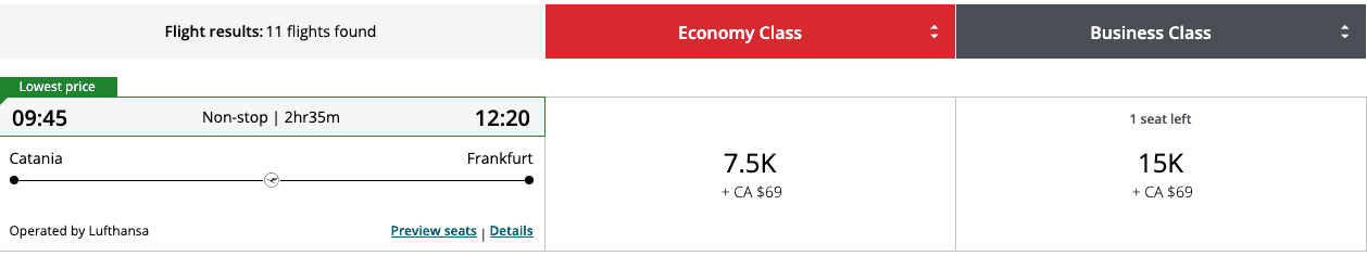Due to the booking fee, the surcharges are relatively high. For instance, the route from Catania to Frankfurt costs CA$69 (~€42) one-way. Checked baggage is included, making the mileage redemption worthwhile given the current high flight prices.