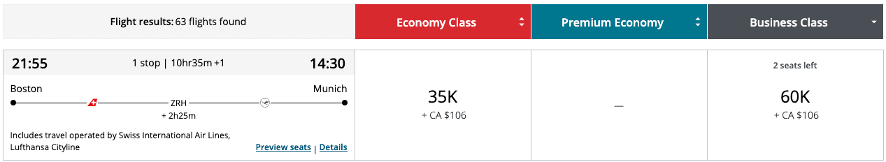 - SWISS business class Boston → Munich for 60,000 miles + CA$106 (~€65) (= €831)