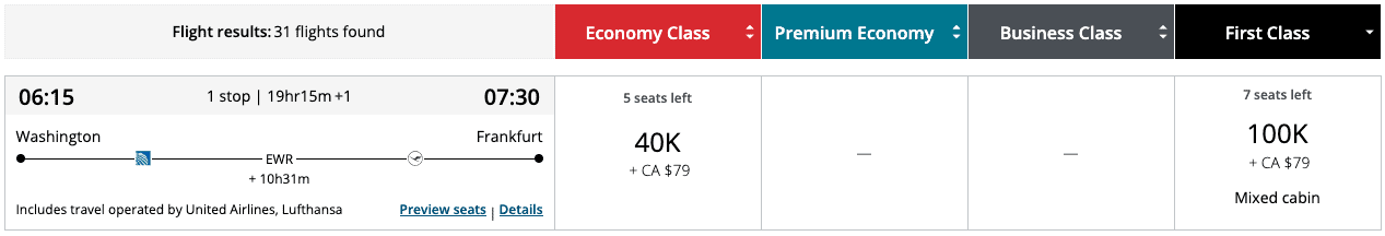 - Lufthansa first class Washington → Frankfurt for 100,000 miles + CA$79 (~€48) (= €1,323)