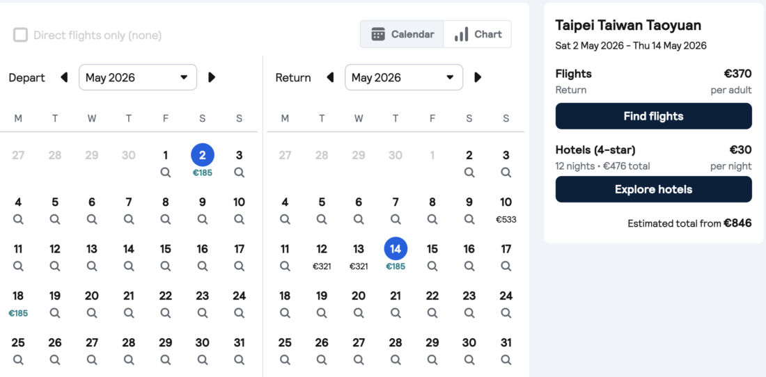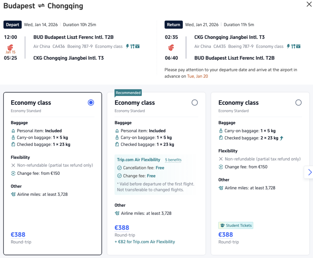 We’ve marked some of the available dates from Stockholm, Budapest, and Copenhagen in green. But feel free to play around a bit with other dates too. The availability is best in April and May 2026. Budapest-Chongqing flights are already available in January.