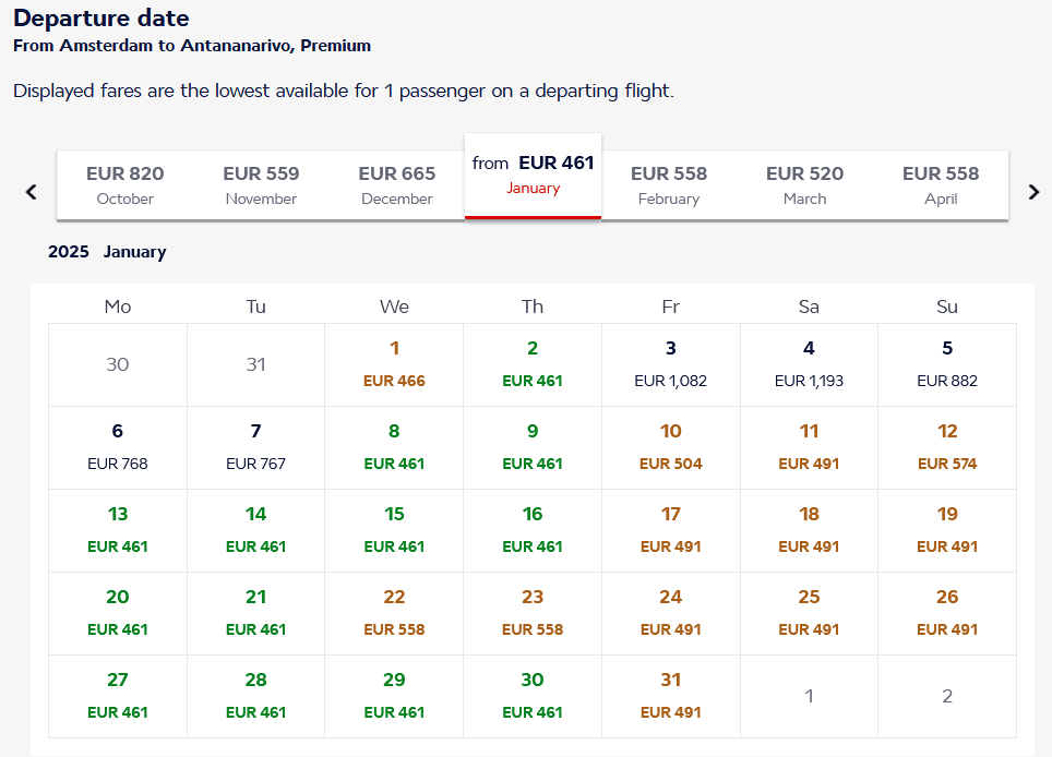 Our availability calendar highlights all possible flight dates at the lowest price for trips up to 28 days. It will forward you to Air France with your selected dates. If the site shows a fare between €1,100 and €1,200, go to Air France’s homepage and go to TNR:A-TNR:A>AMS:A&activeConnection=0&bookingFlow=LEISURE” target=”_blank” rel=”noreferrer noopener”>their calendar by leaving the dates empty.