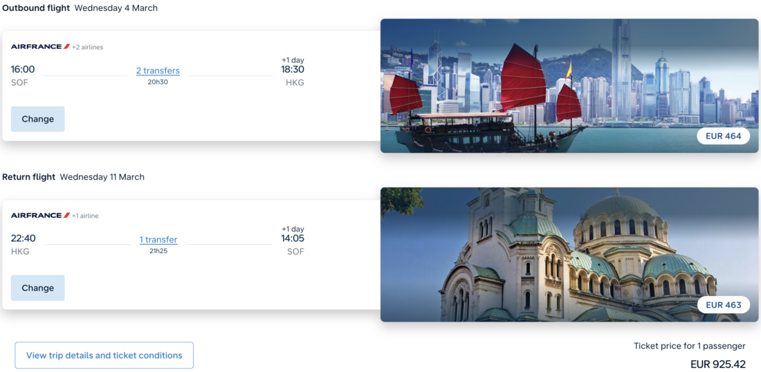 Air France is currently selling premium economy tickets to Hong Kong at a cheaper price than usual if you depart from Sofia. For these flights, Air France uses its A350, with the newer premium economy seats. There’s good availability until June. The Light fare only includes 2 carry-ons and a personal item. The fare that includes 2 pieces of checked luggage costs €160 more.