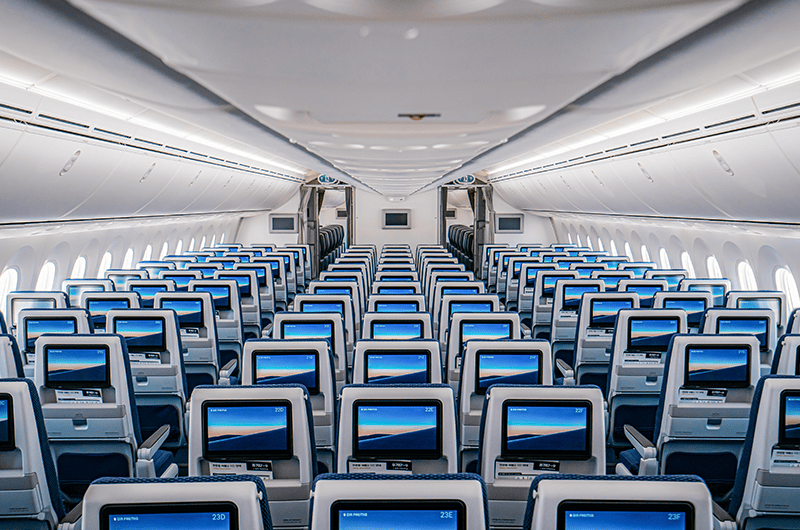 You would fly a daytime flight on a Boeing 787 Dreamliner, which has a 3-3-3 configuration in economy class. The seat pitch varies from 31 to 35 inches according to the airline’s website. Food and in-flight entertainment are included. Premium economy is in a 2-3-2 configuration with a 42-inch pitch.