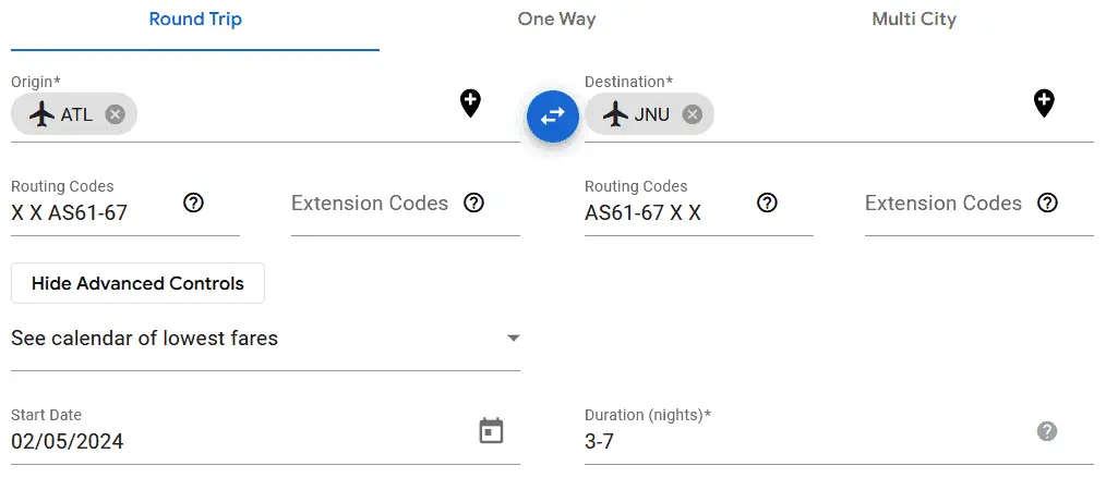 Since the stop in Ketchikan is essential to earn maximum mileage, it makes most sense to search for multi-stop flights. While their multi-stop can only be used by trial-and-error, Google Flights is still the most convenient option to find suiting flight dates. You can also add a stopover in Seattle without rising the ticket price.
