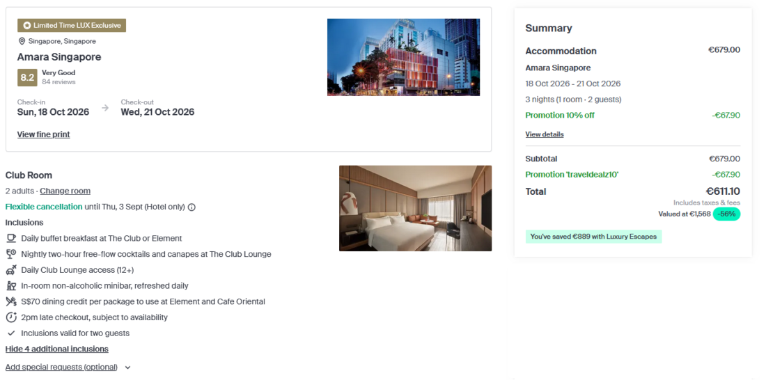 LuxuryEscapes currently has an interesting offer for the 5-star Amara hotel in Singapore. They are charging €227 per night (or even only €205 if it’s your first booking at LuxuryEscapes and you use our exclusive promo code traveldealz10), including breakfast, lounge access, a daily replenished mini-bar, SGD 70 (~€47) dining credit, and a late check-out.