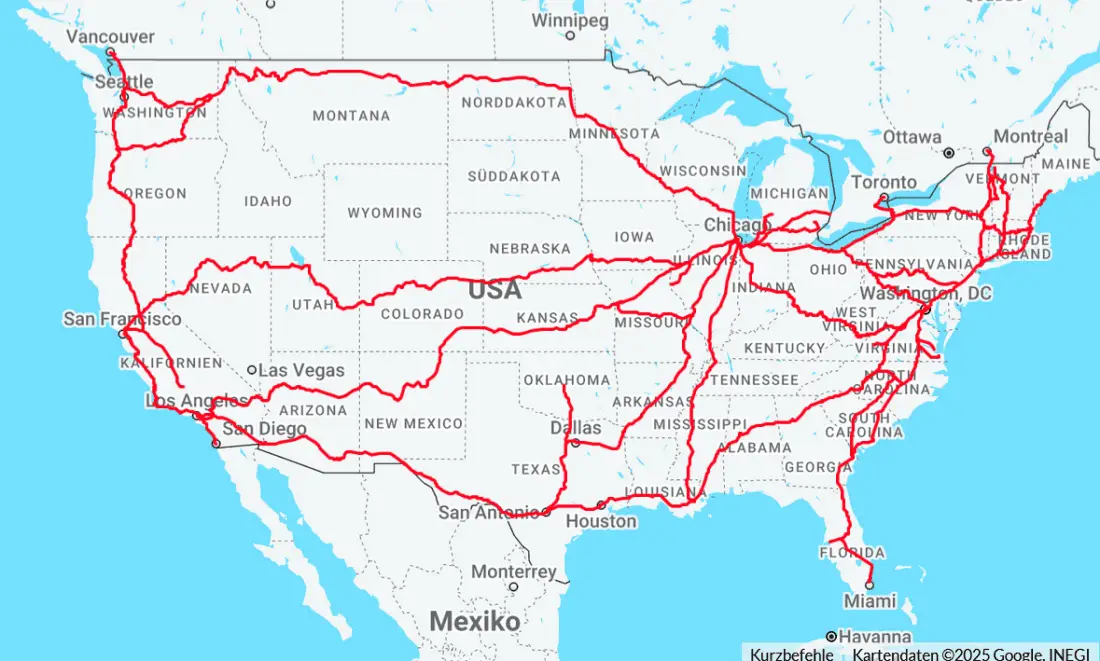 Amtrak’s website not only shows you all possible train lines, you can also track them live. Here is the company’s 2025 network map: