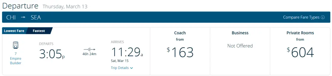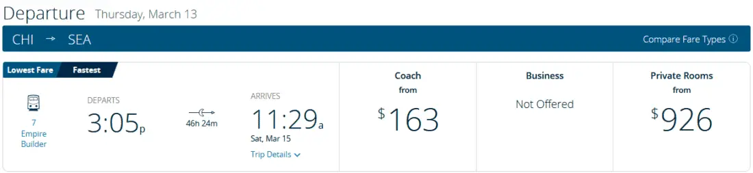 - Chicago → Seattle: 47-hour ride for US$604 (~€515) instead of US$926 (~€790)