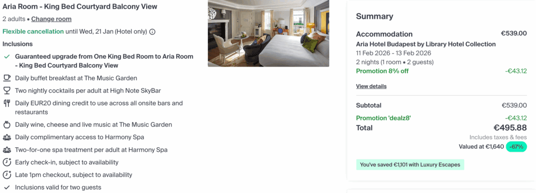 , you’ll only be paying €248 per night, including breakfast, free cheese & wine during the live music, and further extras. The deal is available in November 2025, as well as January to March 2026. However, the price is slightly higher on weekends.