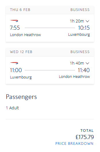 Oneworld stalwart British Airways is currently offering a decent sale for business class tickets within Europe. With departure from London, prices for as little as £176 (~€203) for a roundtrip to Luxembourg, with many other destinations available in that price range. Priority services, lounge access and two checked bags up to 32kg each are included in this fare.