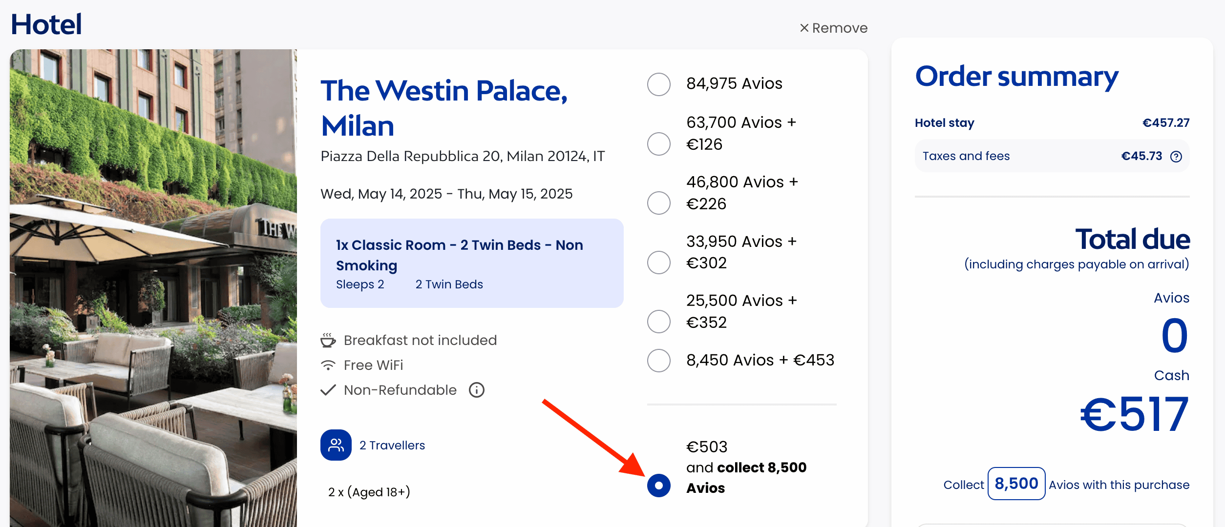 When booking, you must manually select the lowest option to pay the full room price by card and earn Avios. In the following example, you pay €517 including tax and collect 8,500 Avios worth about €85: