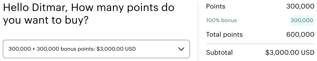 Until December 11, 2025, buying at least 5,000 points (before bonus), you’ll get twice as many points credited. That would bring the price per 1,000 points down to US$5 (~€4) if you purchase at least 26,000 points.