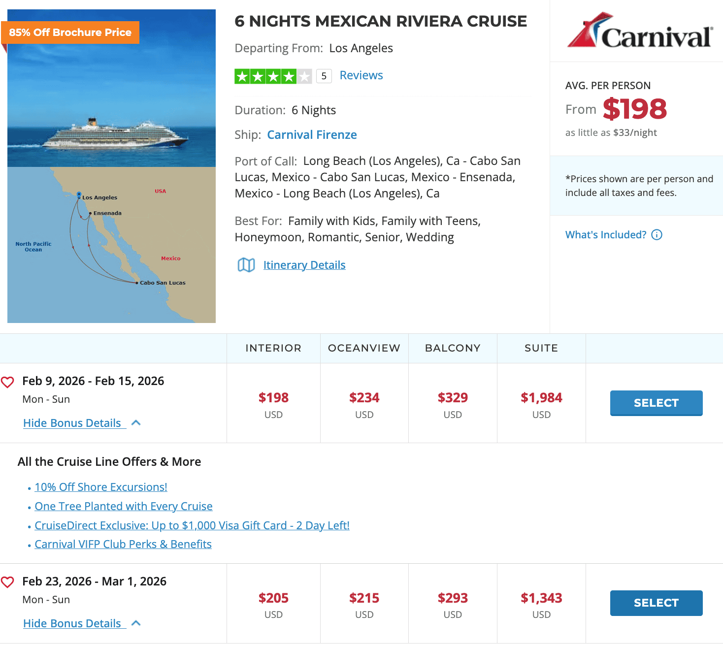 Editor’s Note: Excellent value, especially considering the price of the balcony cabin. If you live in Southern California, I think this cruise is a great option for taking a workcation, allowing you to work remotely from the sea while enjoying Mexico without having to take planes or drive.