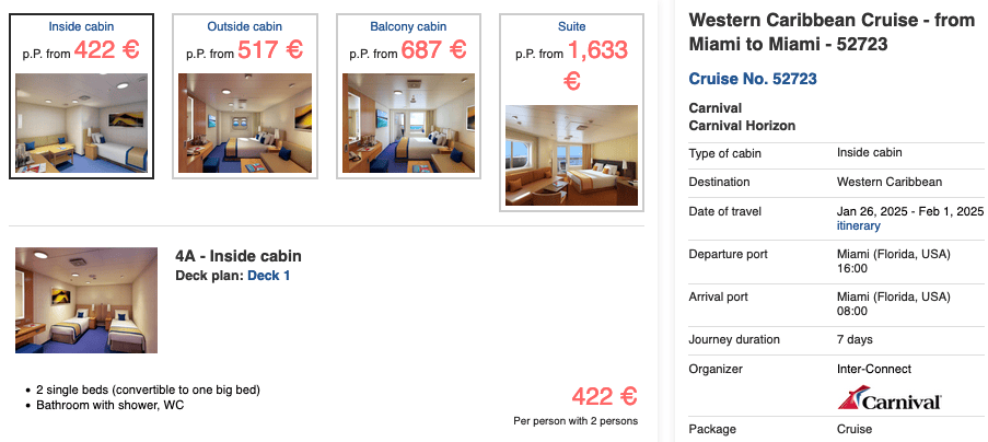 In early 2025, you can spend a week on the Carnival Horizon, cruising from Miami to destinations like Grand Cayman and Cozumel, before returning to Miami – well-fed, entertained, and relaxed. After a hefty price drop, the price now starts at €422 (~US$495) per person for an inside cabin.