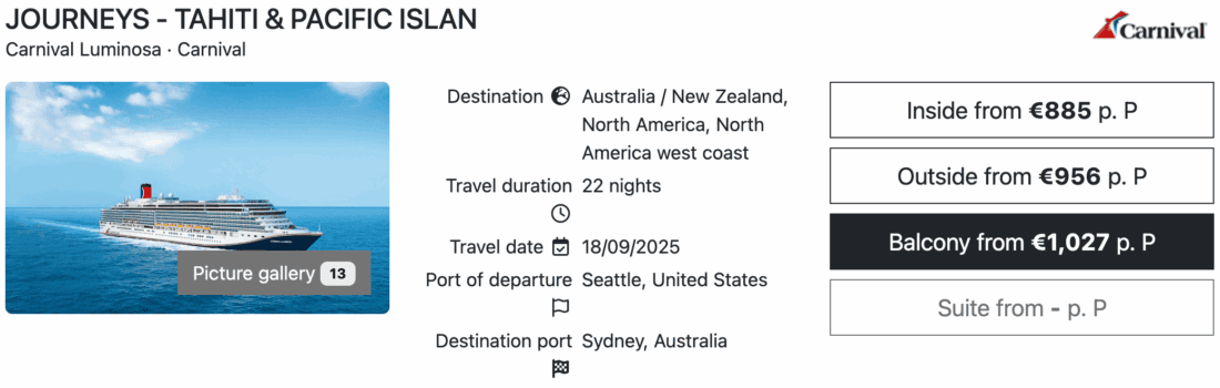 In September 2025, the Carnival Luminosa from the US cruise line Carnival will embark on a longer repositioning cruise. Over the course of 22 nights, the ship will be transferred from Seattle to Sydney. You can currently book this special cruise starting from €885 (~US$1,039) per person in an inside cabin. Oceanview and balcony cabins are available from €956 (~US$1,122) and €1,027 (~US$1,206) per person respectively.