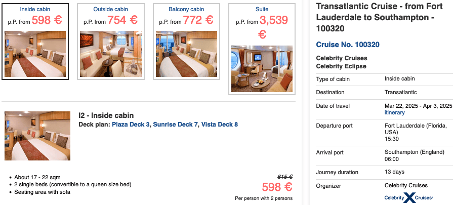 In March 2025, the Celebrity Eclipse from the US-based Celebrity Cruises will embark on a transatlantic cruise from Fort Lauderdale to Southampton. This journey is currently available at attractive booking rates, with inside cabins starting at €598 per person. Highly recommended are the outside cabins starting at €754 and balcony cabins starting at €772 (per person based on double occupancy).