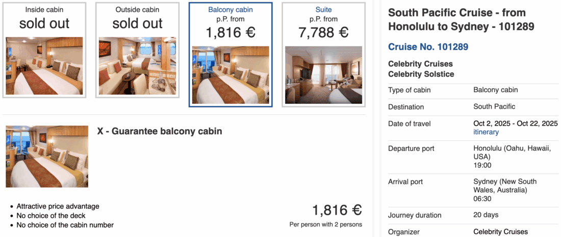 In October 2025, the Celebrity Solstice from the US cruise line Celebrity Cruises will sail from Honolulu to Sydney. The journey includes several stops in French Polynesia and New Zealand. Currently, the balcony cabin merely costs €1,816 (~US$2,101) per person. Furthermore, you’ll get US$200 (~€173) per cabin credited for onboard expenses.