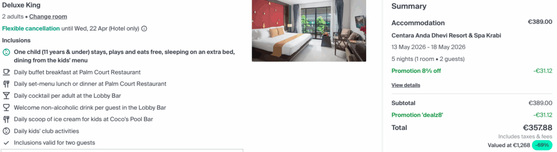 Looking for a cheap but good hotel for your holidays in Krabi? Well, we’ve found one. Thanks to LuxuryEscapes and our dealz8 coupon (which expires on November 20!), you can currently book the Centara Anda Dhevi Resort & Spa Krabi for only €72 per night, including breakfast, a daily meal, and daily cocktails, for max. 2 adults and 1 child. There’s daily availability from April 2026 onwards.