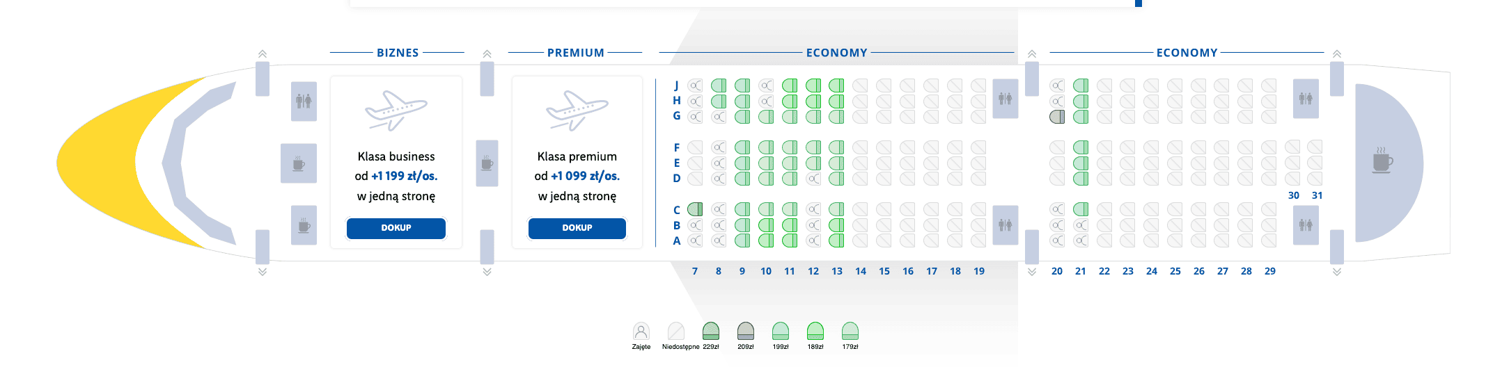 The seat reservation unfortunately comes with an additional cost in all classes starting at PLN 179 (~€42) for economy up to PLN 319 (~€75) for the most expensive business class seat.