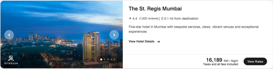 - The St. Regis Mumbai, India, starting at ₹16,189 (~€156)