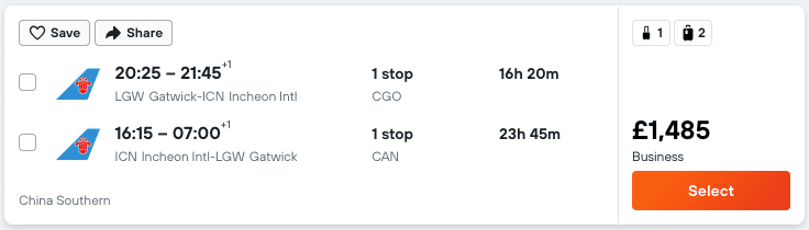 China Southern flies both from London Heathrow and London Gatwick, but the cheapest prices are usually from Gatwick (with a few exceptions). The layover is then usually in either Zhengzhou, Beijing, or Guangzhou. On the long-haul flights between London and China, you’ll be sitting in lie-flat seats. On the ~ 2-hour flights between China and Korea/Japan, you’ll usually sit in recliner seats.