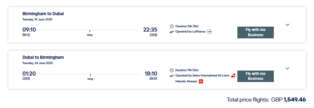 The business class flights are issued in booking class P. If you want to earn as many miles as possible with your booking, it makes a huge difference is you purchase a Lufthansa or s Swiss ticket. For example, the cheapest flight from Birmingham to Dubai earns the following when flying Swiss via Zurich: