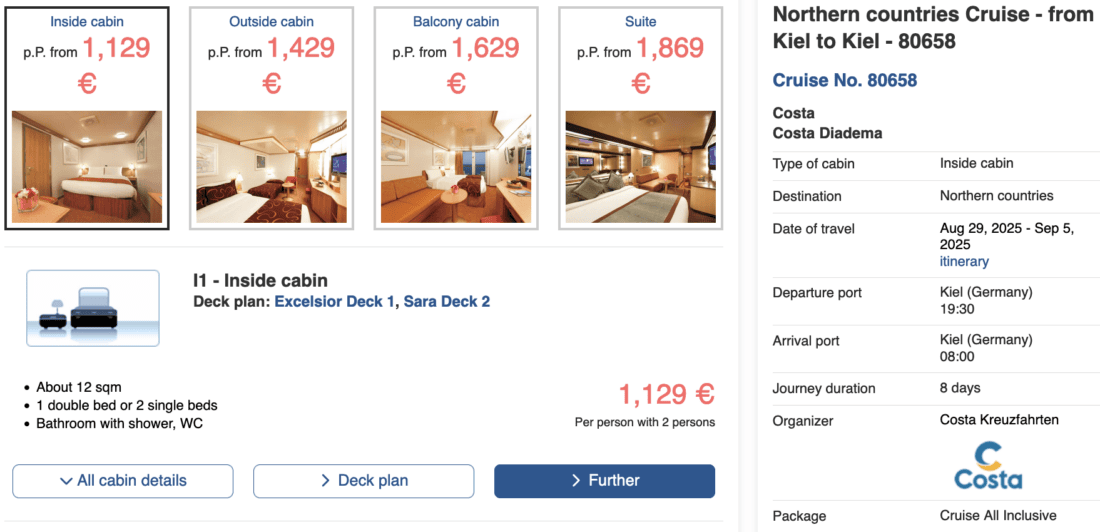 The Costa Diadema will be operating various cruises from Kiel to Northern Europe in the summer of 2025. Currently, you can book these 8-day cruises at a reasonable price. Interior cabins for these trips are available starting at €1,129 per person. What’s most special about this price is that it includes the All-Inclusive package.