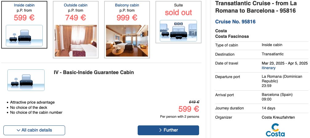 The booking site shows a slightly higher price in the first booking step. From the second step onward, the correct price of €599 per person should be displayed.