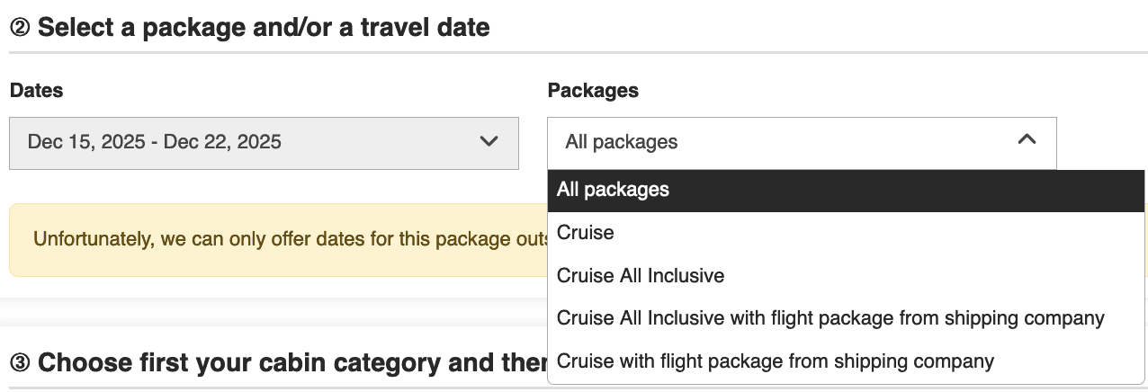 The website will first try to sell you a package incl. flights, but this is not necessarily a good option. We recommend that you switch the view to “all packages” to see which option suits you best. If you’re not a heavy drinker, “cruise only” is probably the best option.